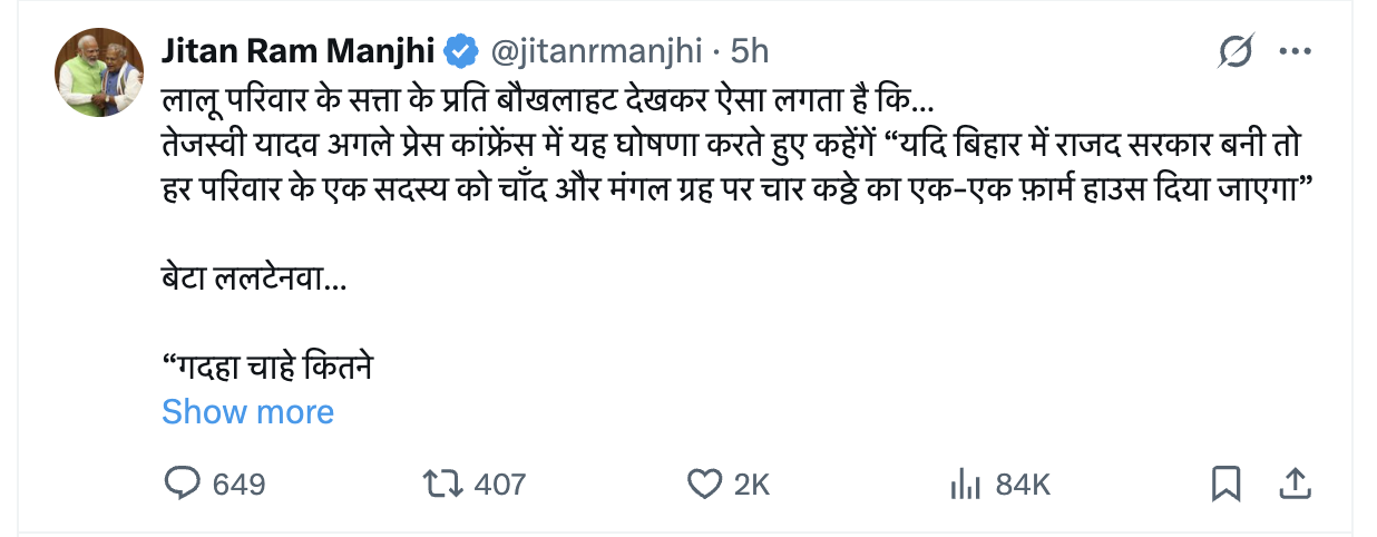 “तेजस्वी यादव अगले प्रेस कांफ्रेंस में यह घोषणा करते हुए कहेंगें – यदि बिहार में राजद सरकार बनी तो हर परिवार के एक सदस्य को चाँद और मंगल ग्रह पर चार कठ्ठे का एक-एक फ़ार्म हाउस दिया जाएगा” – जीतराम मांझी का ट्वीट