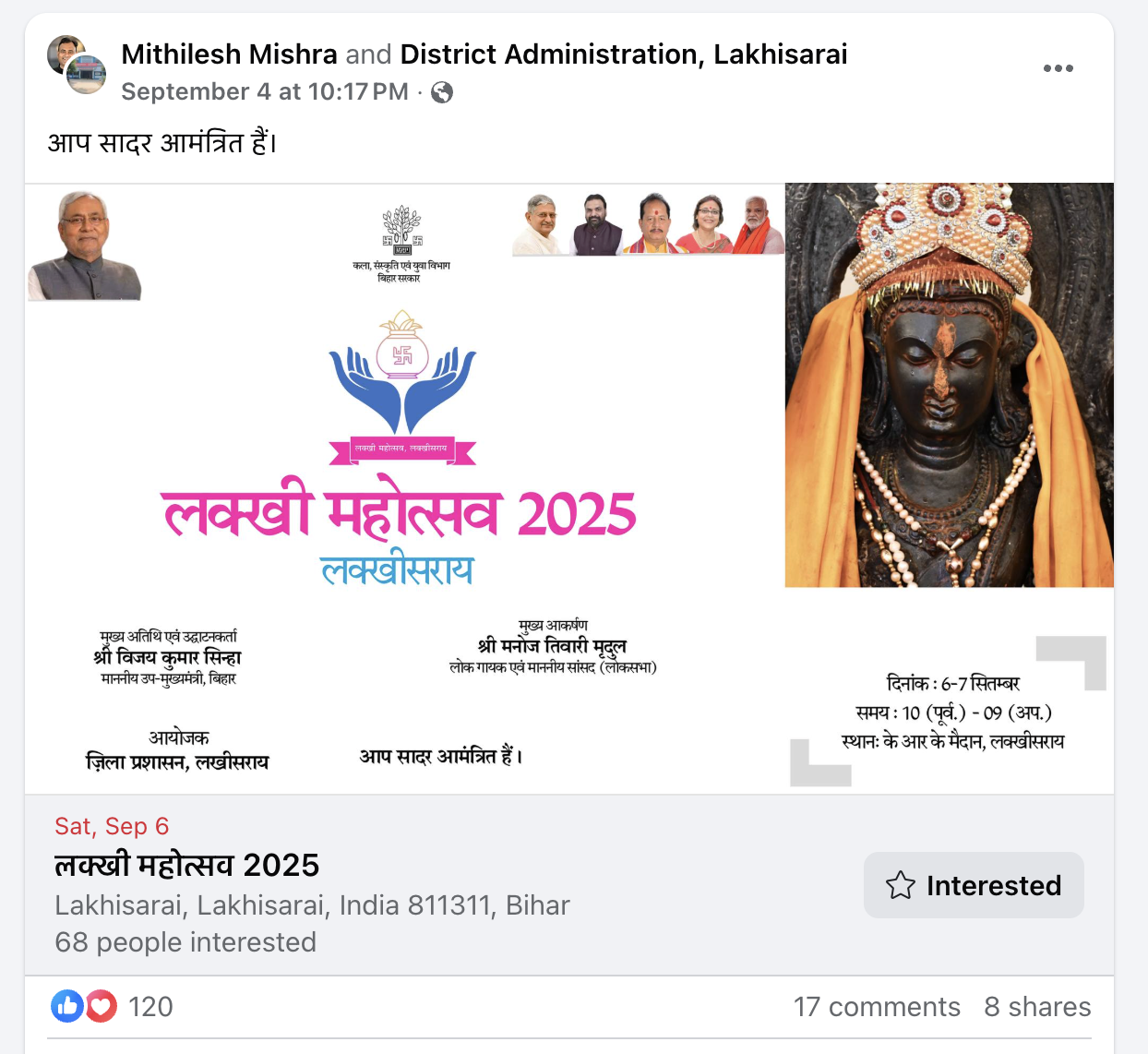 बीते शनिवार को अनंत चतुर्दशी के मौके पर दो दिवसीय ‘लक्खी अमृत महोत्सव-2025’ की शुरूआत हुई। इस कार्यक्रम का आयोजन जिला प्रशासन की ओर से किया गया, चौंकाने वाली बात यह है कि आयोजन के नाम के साथ ही जिले के नाम को भी ‘लक्खीसराय’ के रूप में प्रचारित किया गया जबकि आधिकारिक नाम लखीसराय है। डीएम ने अपने फेसबुक पेज से इस महोत्सव के जो पोस्टर जारी किए, उसमें जिले का नाम लक्खीसराय लिखा हुआ है। कार्यक्रम का उद्घाटन स्थानीय विधायक व डिप्टी सीएम विजय कुमार सिन्हा ने किया।