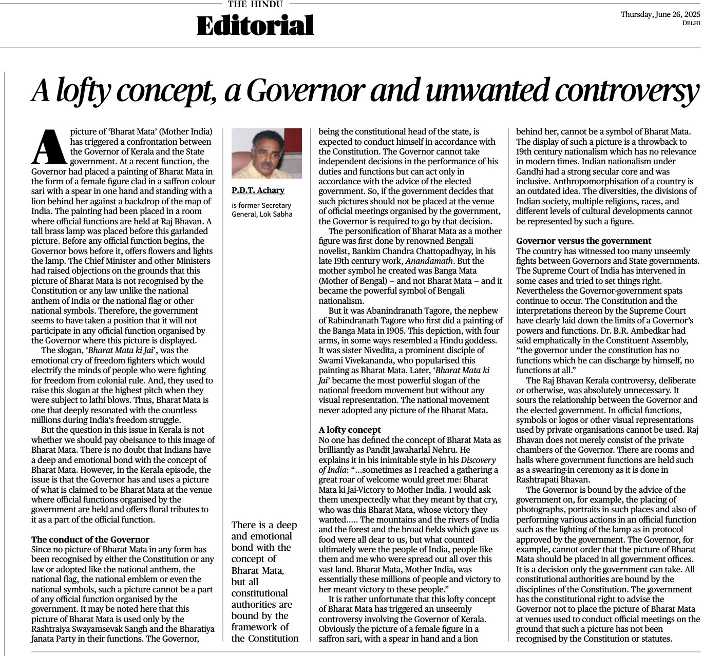 द हिन्दू में 26 जून 2025 को प्रकाशित लेख “A Lofty Concept, a Governor and Unwanted Controversy” में इस विवाद को अनावश्यक और भारत माता के चित्र को उच्च अवधारणा बताया गया है। इस लेख को लिखने वाले पी.डी.टी. अचारी लोकसभा के पूर्व महासचिव रहे हैं और वे संवैधानिक व संसदीय मामलों के विशेषज्ञ हैं। अचारी ने लिखा है कि केरल के राज्यपाल राजेंद्र विश्वनाथ अर्लेकर ने राजभवन में सरकारी आयोजनों में एक विशेष चित्र—जो भगवा साड़ी में एक महिला, हाथ में भाला, पीछे शेर और अखंड भारत के नक्शे को दर्शाता है—को प्रदर्शित करने और सम्मान करने की प्रथा शुरू की। लेख के अनुसार, भारत माता का यह चित्र संविधान या कानून द्वारा मान्यता प्राप्त नहीं है, न ही यह राष्ट्रीय ध्वज, राष्ट्र गान या प्रतीक की तरह आधिकारिक है। इसलिए, इसे सरकारी आयोजनों में शामिल करना अनुचित है।