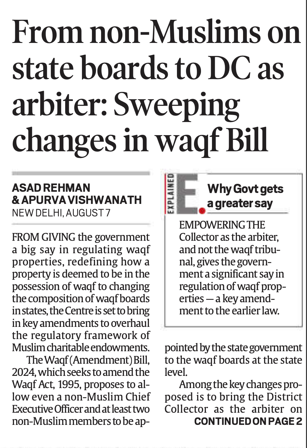 द हिन्दू व इंडियन एक्सप्रेस ने आठ अगस्त को पहले पन्ने पर प्रस्तावित संशोधनों को लेकर खबर दी कि संसद में इस सप्ताह प्रस्तावित हो सकने वाले बिल में यह बदलाव भी प्रस्तावित है कि इसमें दो गैर मुस्लिम सदस्य शामिल होंगे व दो मुस्लिम महिला सदस्य भी होंगी। इसके अलावा, वक्फ जिन जमीनों को अपने होने का दावा करेगा, उनका सत्यापन डीएम करेगा न कि वक्फ ट्रिव्यूनल। इंडियन एक्सप्रेस ने अपनी खबर में यह भी बताया है कि उपयोग के आधार पर वक्फ के प्रावधान को भी नया संशोधन खत्म कर देगा। इससे कई ऐसी जमीनों को लेकर समस्या आएगी जिनका वक्फनामा नहीं बना हुआ है और उन्हें मौखिक रूप से वक्फ किया गया था और अब वह धार्मिक उपयोग में आ रही है, जैसे- मस्जिद की जमीन। यह भी लिखा गया है कि यह कानून लागू होने के बाद जितने भी ‘विवादित’ मामले हैं, उनका सत्यापन दोबारा कराया जाएगा। यानी विशेषज्ञ मान रहे हैं कि जिन मामलों में वक्फनामा न हुआ हो, नए नियम के बाद उन्हें विवादित मानते हुए डीएम सत्यापित कर सकता है कि वह सरकारी जमीन मानी जाएगी या फिर वक्फ की।