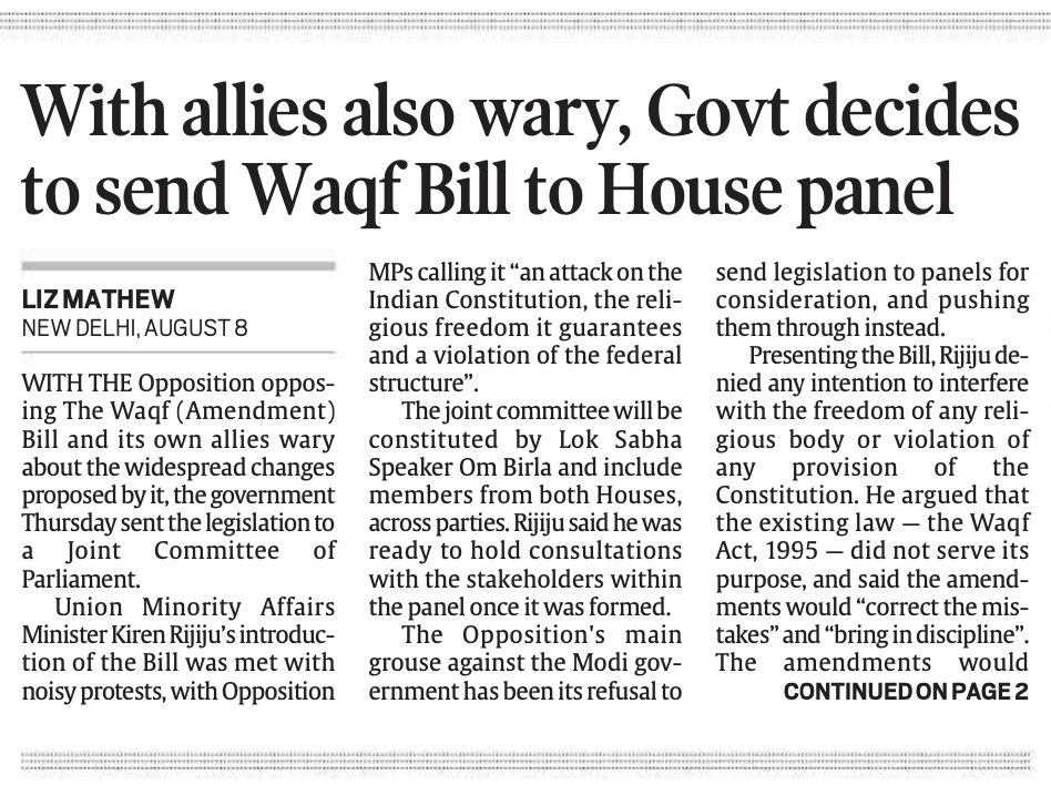 हालांकि अमर उजाला की हेडिंग में ये बात शामिल है। हेडिंग – ‘वक्फ संशोधन विधेयक लोकसभा में पेश, विचार के लिए भेजा गया।’ दैनिक हिन्दुस्तान नेे इस खबर को विशेष महत्व न देते हुए एक कॉलम पहले पन्ने पर लगाया जिसकी हेडिंग है – वक्फ संशोधन बिल विरोध के बीच पेश। अंदर लिखा है कि इंडिया गठबंधन को इस मामले पर वाईएसआर कांग्रेस का साथ मिल गया जबकि जदयू व टीडीपी सरकार के साथ है। द हिन्दू ने भी अमर उजाला के एंगल पर ही खबर लगाई है लेकिन तेलुगू देशम पार्टी (टीडीपी) के सांसद के हवाले से लिखा है कि ‘वे इस विधेयक का समर्थन करते हैं, अगर इसे विचार के लिए संसदीय समिति को भेज दिया जाता है।’ मतलब साफ है कि सहयोगी दल ने सशर्त समर्थन दिया है, इसी एंगल को एक्सप्रेस ने उठाते हुए पहले पन्ने पर ये खबर बनाई है – सहयोगी दलों के भी चिंता जताने के बाद सरकार ने संसदीय पैनल को भेजा वक्फ बिल (हिन्दी अनुवाद) । इसी दिन एक्सप्रेस ने वक्फ व इस अधिनियम के प्रस्तावित बदलावों पर आधे पन्ने का एक्सप्लेनर भी प्रकाशित किया है।