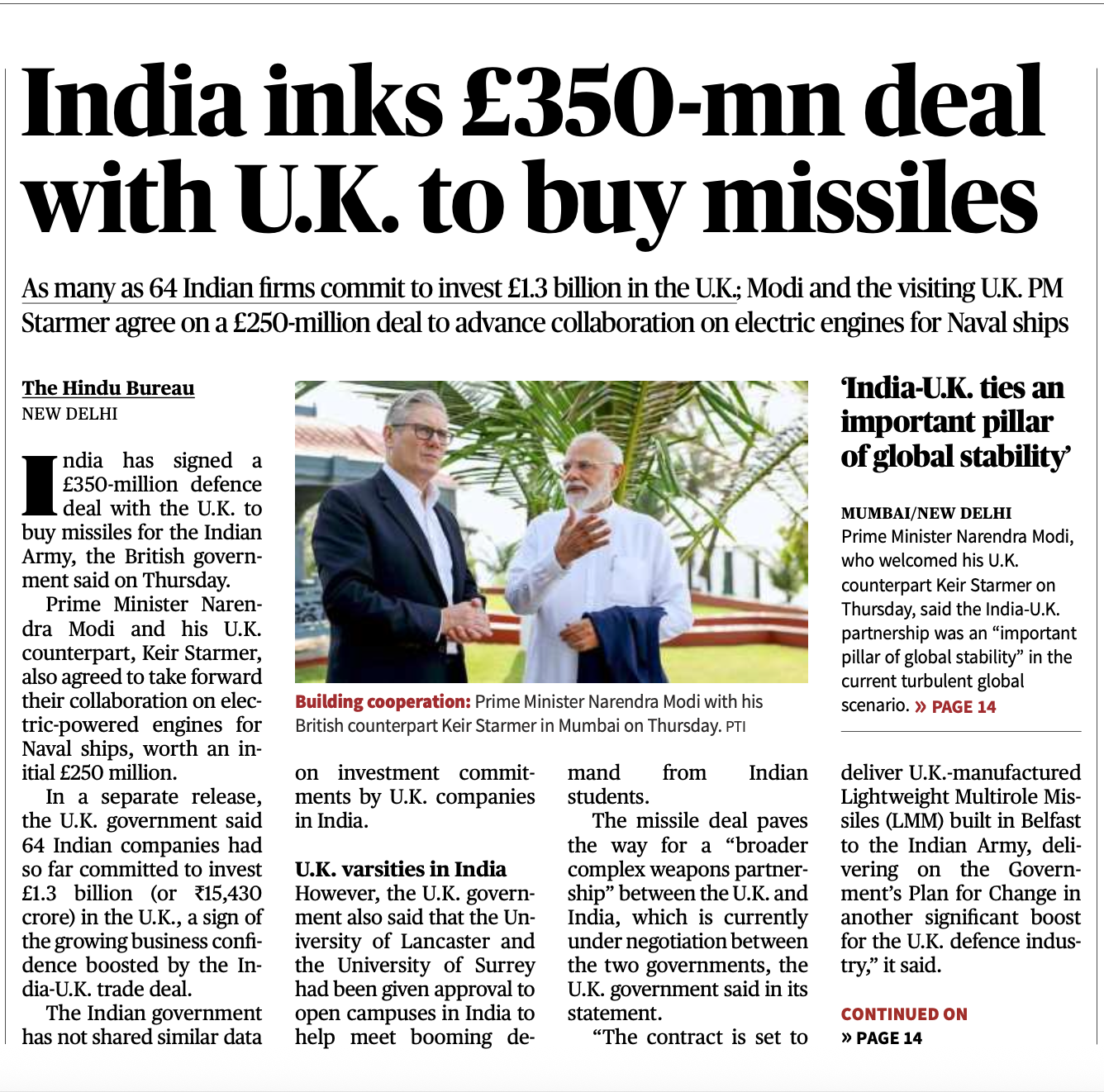 द हिन्दू औ हिन्दुस्तान टाइम्स अखबारों ने ब्रिटिश पीएम स्टार्मर के भारत दौरे के दौरान हुए एक बड़े मिसाइल सौदे को पहली खबर बनाया है।