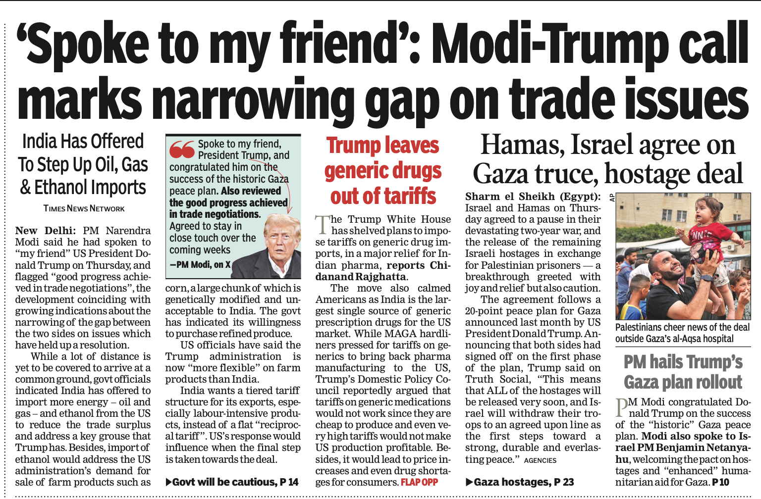 द टाइम्स ऑफ इंडिया अखबार ने मोदी की ट्रंप से हुई फोन वार्ता को खबर बनाया है, मोदी ने गज़ा प्लान पर मोदी को बधाई देने के लिए फोन किया था। हालांकि अखबार ने पीएम के ट्वीट के जरिए आई इस जानकारी के उस हिस्से को प्राथमिकता दी गई है, जिसमें मोदी ने लिखा कि उन्होंने ट्रंप से व्यापार मुद्दे पर सहमति बनाने की दिशा में बात की।