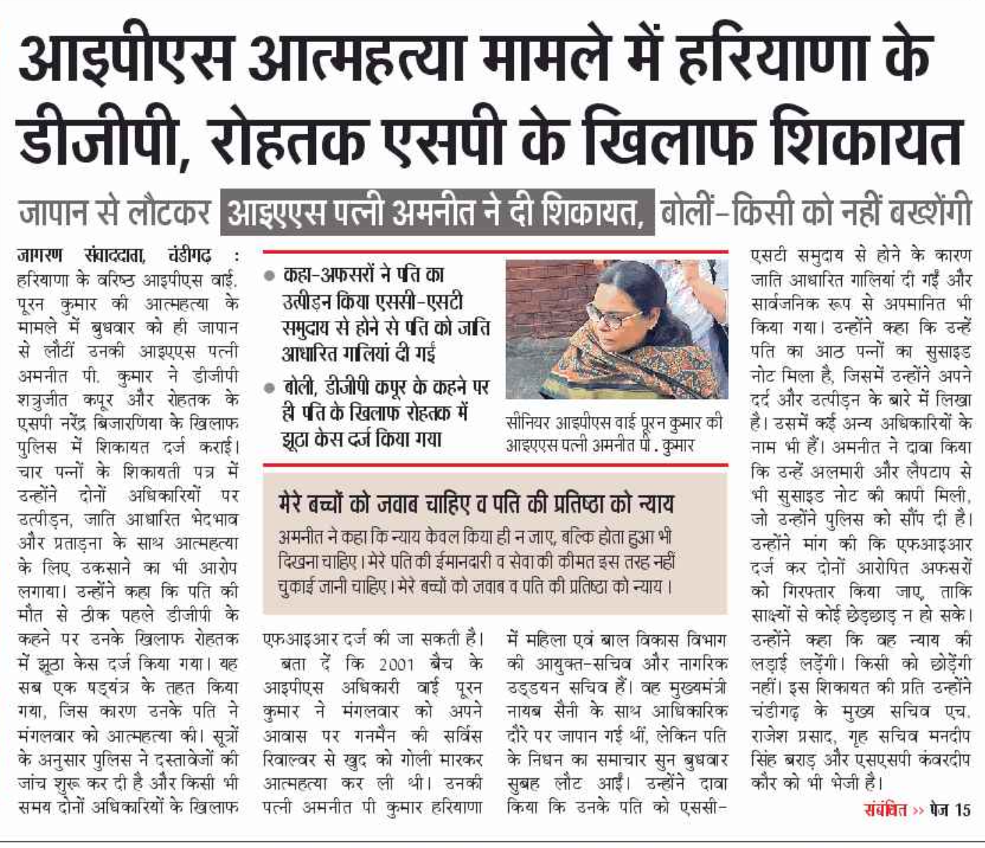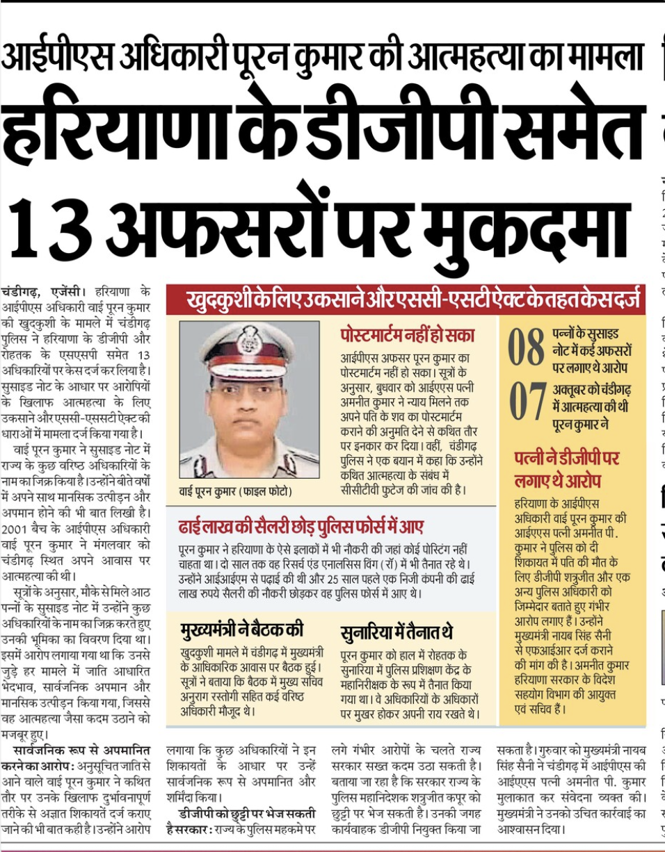 हरियाणा के ADGP की खुदकुशी के मामले में जातिगत भेदभाव के आरोप में हरियाणा के DGP व 10 अफसरों पर केस होने की खबर दैनिक जागरण और दैनिक हिन्दुस्तान ने लीड लगाई है।