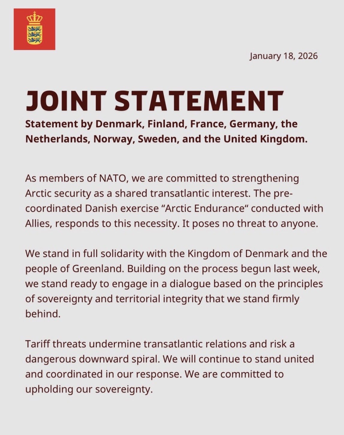 साझा बयान में कहा गया- , “नेटो सदस्य के रूप में हम एक साझा ट्रांसअटलांटिक हित को देखते हुए आर्कटिक क्षेत्र की सुरक्षा को मज़बूत करने के लिए प्रतिबद्ध हैं। हम डेनमार्क और ग्रीनलैंड के लोगों के साथ पूरी एकजुटता से खड़े हैं, पिछले हफ़्ते शुरू हुई प्रक्रिया को आगे बढ़ाते हुए हम संप्रभुता और क्षेत्रीय अखंडता के उन सिद्धांतों के आधार पर बातचीत के लिए तैयार हैं, जिनका हम मज़बूती से समर्थन करते हैं।”