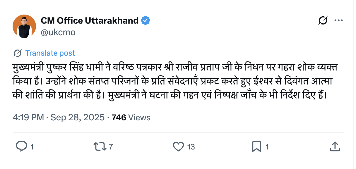 28 सितंबर को राज्य सरकार ने राजीव की मौत के मामले में जांच के आदेश दिए (screen grab – @ukcmo)