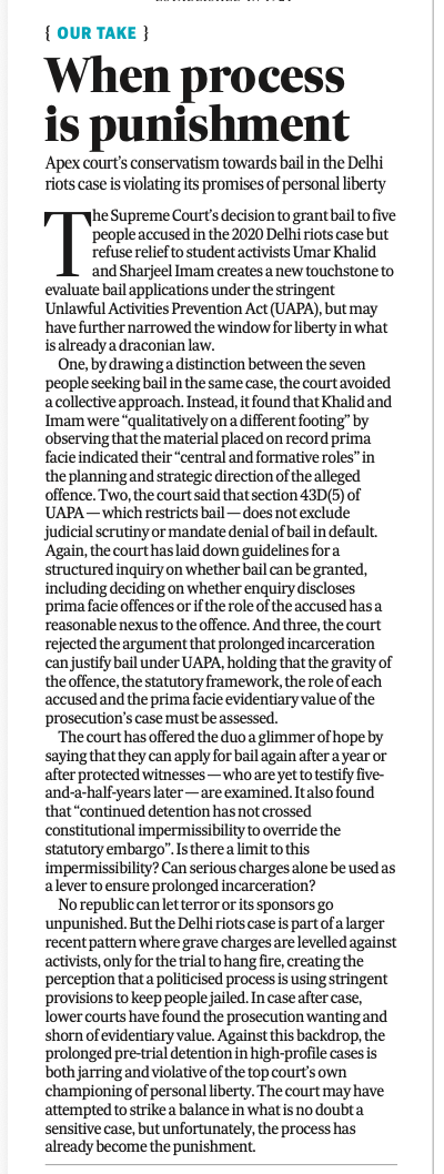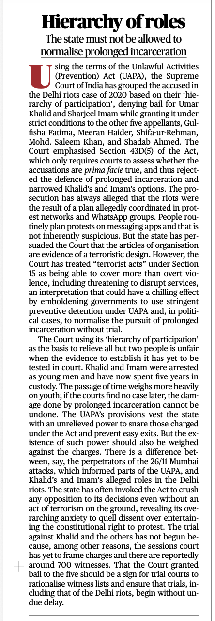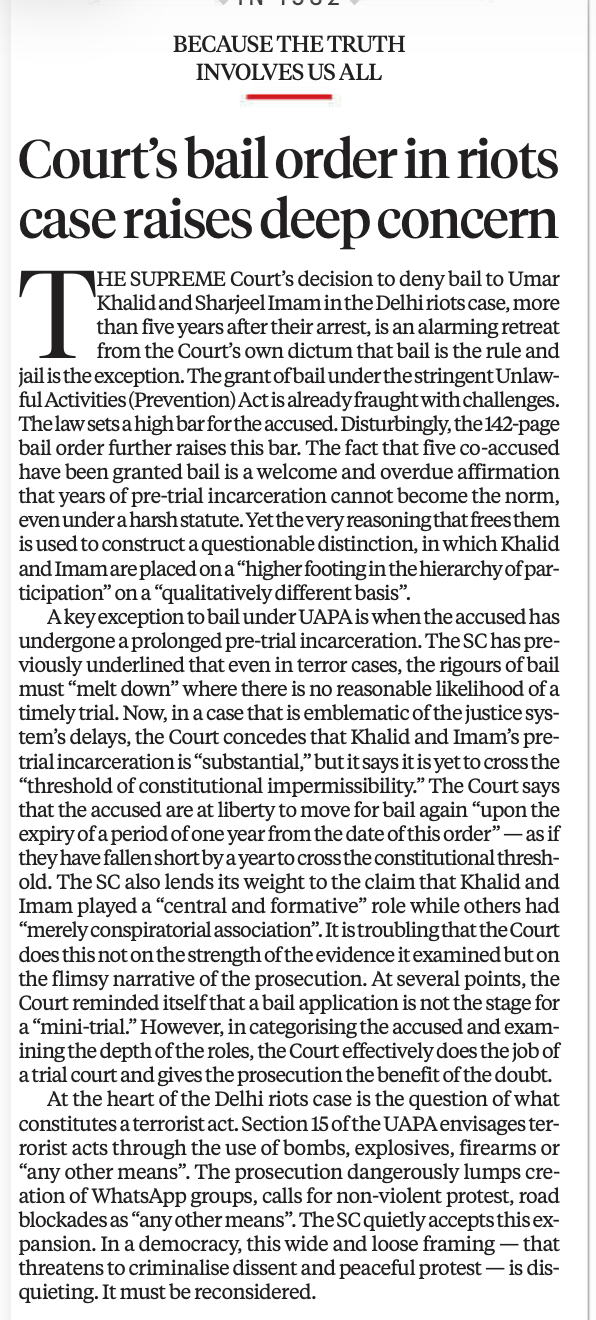 अखबार ने लिखा कि खालिद की पांच साल की ट्रायल पूर्व कैद के बावजूद जमानत से इनकार किया जाना चिंताजनक है। यूएपीए जैसे कठोर कानूनों में जमानत मिलना मुश्किल होता है, क्योंकि यह कानून आरोपी पर ही खुद को निर्दोष साबित करने का बोझ डालता है। कोर्ट ने खालिद की भूमिका को साजिश से जुड़ा बताया जो हिंसा से अलग और उससे जुड़ी हुई है। पर यह व्याख्या खतरनाक है क्योंकि यह राज्य को बिना ठोस सबूत के आरोपी को लंबी हिरासत की शक्ति देती है। कई सह-अभियुक्तों को जमानत मिल चुकी है, लेकिन उमर खालिद को दिल्ली दंगे में “भूमिकाओं के पदानुक्रम” में ऊपर रखकर जमानत से इनकार किया गया। यूएपीए का दुरुपयोग राजनीतिक असहमति दबाने में हो रहा है, व्यक्तिगत स्वतंत्रता को प्राथमिकता मिलनी चाहिए।