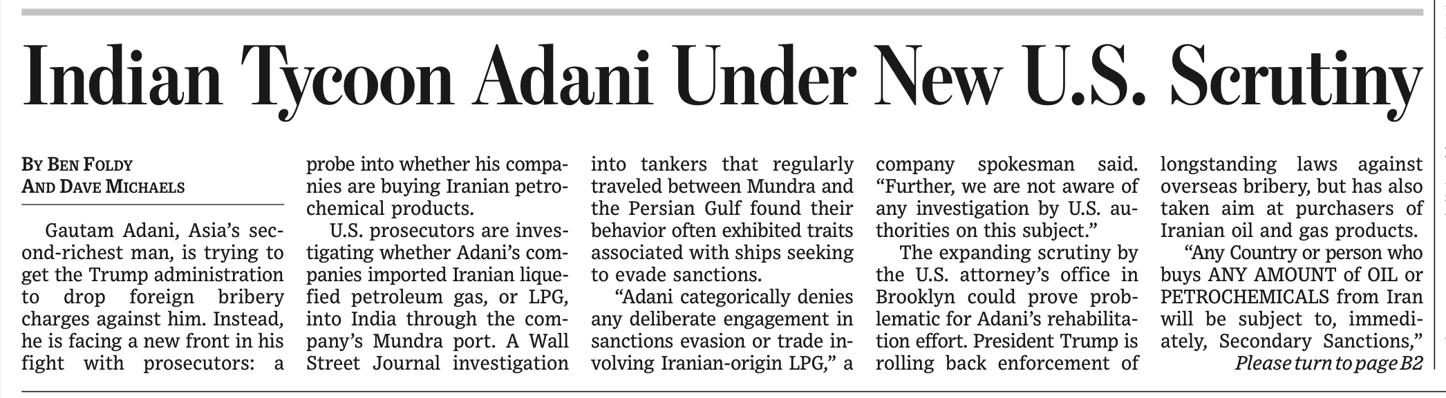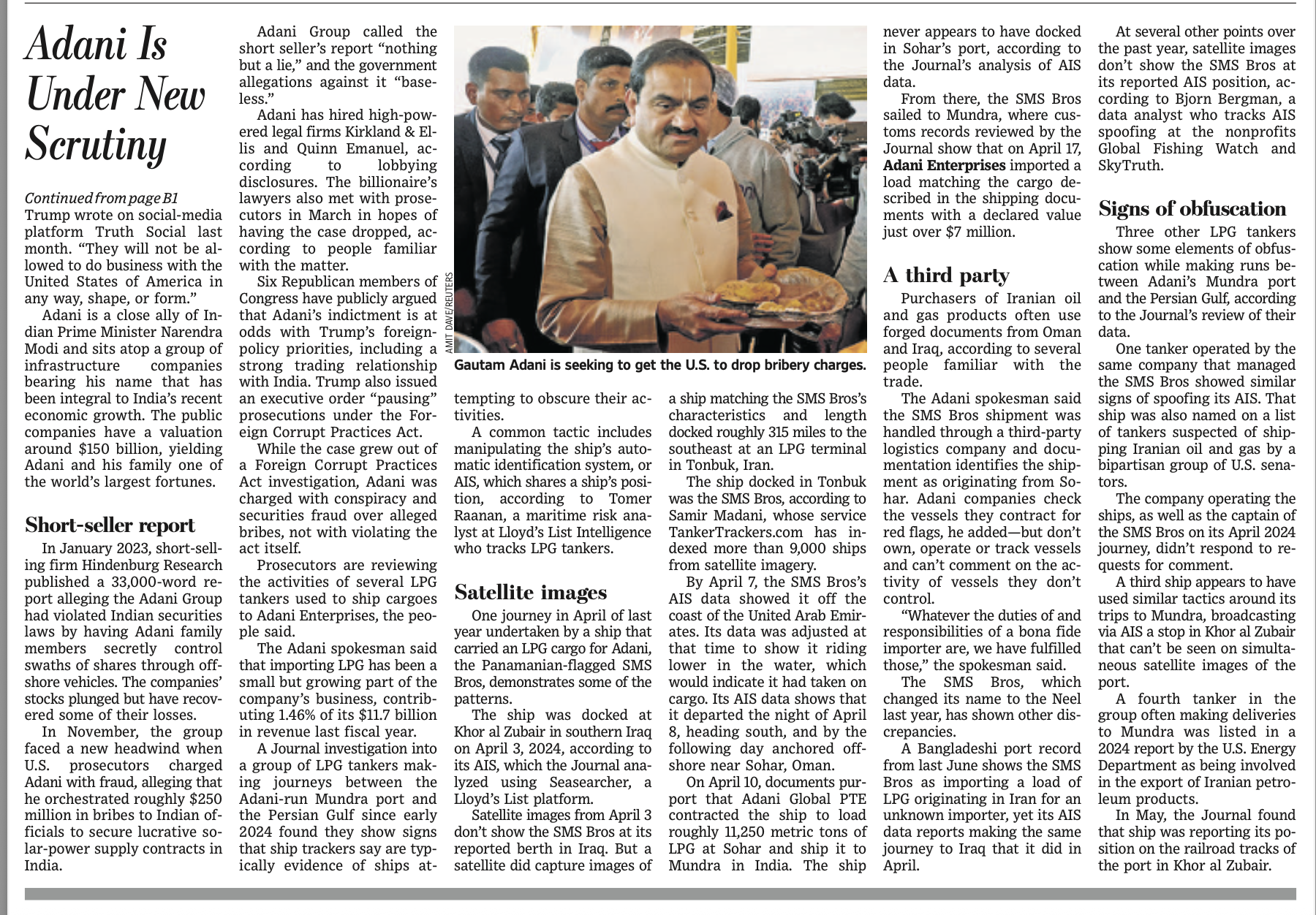 अखबार ने इस मामले में अदाणी के बयान को भी प्रमुख ख़बर में छापा है जिसमें कहा गया है कि – अदाणी समूह की कंपनियों और ईरानी एलपीजी के बीच संबंध का आरोप लगाने वाली वॉल स्ट्रीट जर्नल की रिपोर्ट निराधार और नुकसान पहुंचाने वाली है। अदाणी जानबूझकर किसी भी तरह के प्रतिबंधों से बचने या ईरानी एलपीजी से जुड़े व्यापार में संलिप्तता से साफ़ इनकार करता है। हमें इस विषय पर अमेरिकी अधिकारियों द्वारा किसी भी जांच की जानकारी नहीं है।